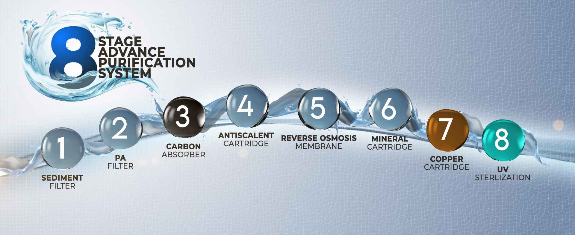 At this stage, the copper ions are infused into the water which destroys the microbial activities. It also adds the antioxidant properties to the water and helps in improving immunity.